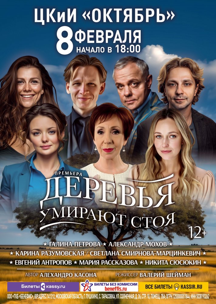Спектакль «ДЕРЕВЬЯ УМИРАЮТ СТОЯ» 8 февраля 2026г. 18:00 Алехандро Касона Долгие годы сеньора Бальбоа живет в ожидании встречи с любимым внуком. Супруг сеньоры узнает жестокую правду: их внук стал мошенником и проходимцем. Чтобы уберечь жену от потрясения, сеньор Бальбоа обращается за помощью в «Ателье иллюзий», где нанятый актёр берется предстать перед сеньорой в роли «любимого внука». Задача непростая… Ведь«правда» - это так легко, а «ложь» надо придумать. Неожиданное стечение обстоятельств меняет заранее продуманный ход событий... Трогательная, полная неожиданностей история о любви, мечтах и силе маленькой лжи во имя большого счастья! Режиссер: н.а. РФ - Валерий Шейман В спектакле участвуют популярные актёры театра и кино: Заслуженная артистка РФ Галина Петрова Заслуженный артист РФ Александр Мохов Актриса театра и кино Карина Разумовская Актер театра и кино Евгений Антропов Актриса театра и кино Мария Рассказова Актер театра и кино Никита Сюсюкин