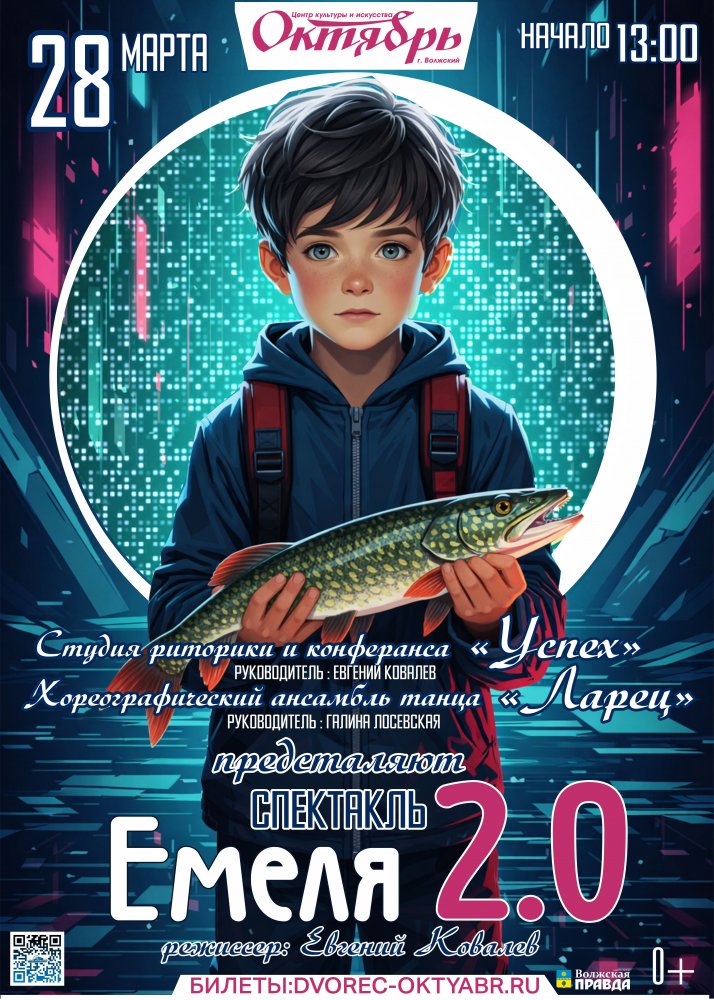 28 марта 2026.г 14:00 "Емеля 2.0" - это не просто сказка, а веселый и динамичный балаган в современной обработке! Знакомая история о ленивом Емеле, царевне Несмеяне и волшебной щуке наполняется новым юмором и энергией. В спектакле гармонично переплетаются народные мотивы и современные ритмы – звучат как традиционные композиции, так и музыка в современной обработке. Оживают не только герои, но и сама Речка, исполняя завораживающий танец. Особую ценность постановке придает сочетание талантов: роли исполняют начинающие актеры студии «Успех», а хореографические номера виртуозно представляют опытные танцоры ансамбля «Ларец». Это яркое, интерактивное шоу, где зрители становятся соучастниками волшебства, а доброта и смекалка побеждают лень и капризы.