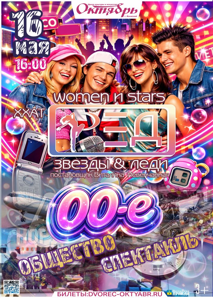 16 мая 2026г. 16:00 Помните, какими были 2000-е? «Общество. «Спектакль» Нулевые» — возможность поймать дух того времени, оживить его на сцене и увидеть, как энергия прошлого вдохновляет нас сегодня! Концерт художественного хореографического ансамбля «Р.Е.Д. звезды и Р.Е.Д. Леди» — не просто хореографический отчет. Это размышление о том, как времена формируют стиль, эмоции и взгляд на мир! Как танец становится зеркалом эпохи и способом рассказать историю целого десятилетия! Почувствуйте драйв и свободу движения вместе с нами! Балетмейстер ансамбля — Виталина Невенчаная.